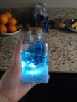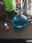 Supplies – pick your Lyrium (I used Blue Gatorade for my first potion and am using blue vodka for this tutorial because I am an adult), waterproof LEDs (that waterproof part is important, I used plain white ones but any color will work depending on your potion, I recommend getting a bunch of these because sometimes you get a dud, and they glow for 8+ hours but they do fade over time), glass bottles with corks, non-toxic glue, leather or clothe cording, a knife or tiny scissors.
